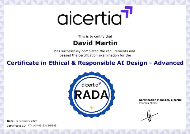 La certificación RADA me permitió validar mi enfoque en el diseño ético y abrir puertas en proyectos de IA con instituciones públicas.”