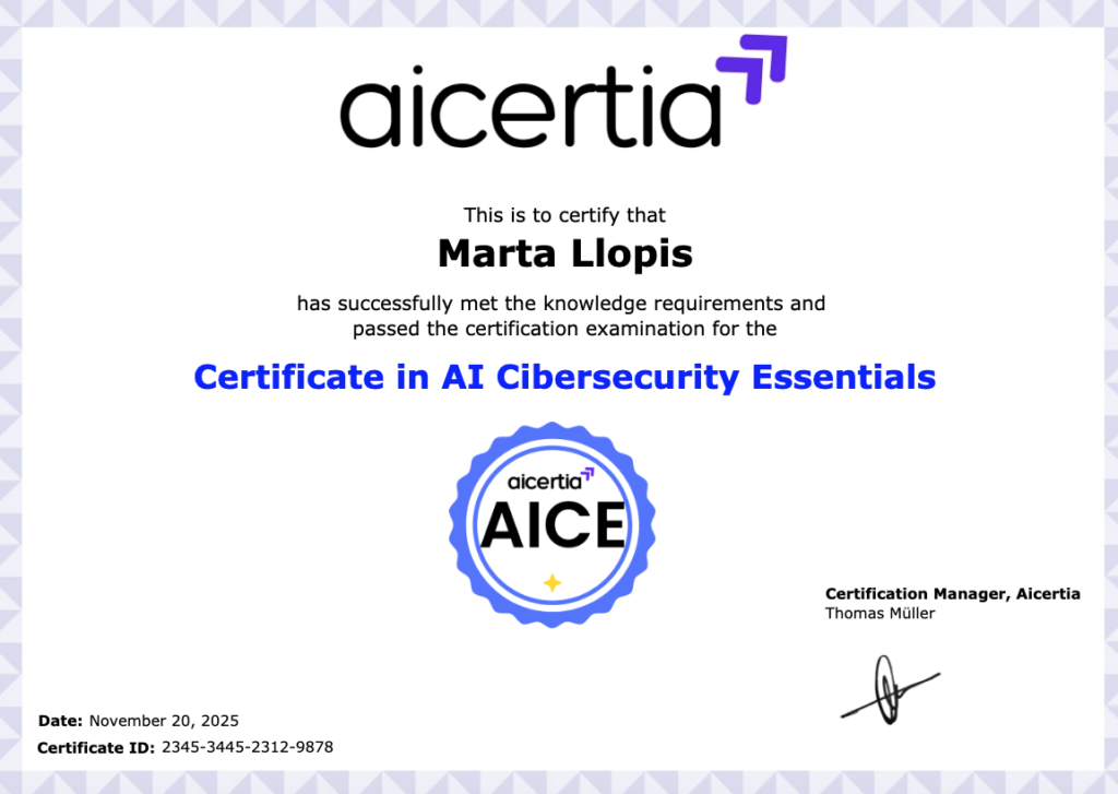 La Certificación AI Cibersecurity Essentials de Aicertia está diseñada para evaluar y acreditar tu comprensión de los riesgos, amenazas y buenas prácticas de ciberseguridad en entornos que integran IA. Esta certificación valida tus conocimientos fundamentales sobre cómo proteger modelos de IA, asegurar los datos, prevenir ataques y cumplir con normativas clave, sin necesidad de conocimientos técnicos avanzados.